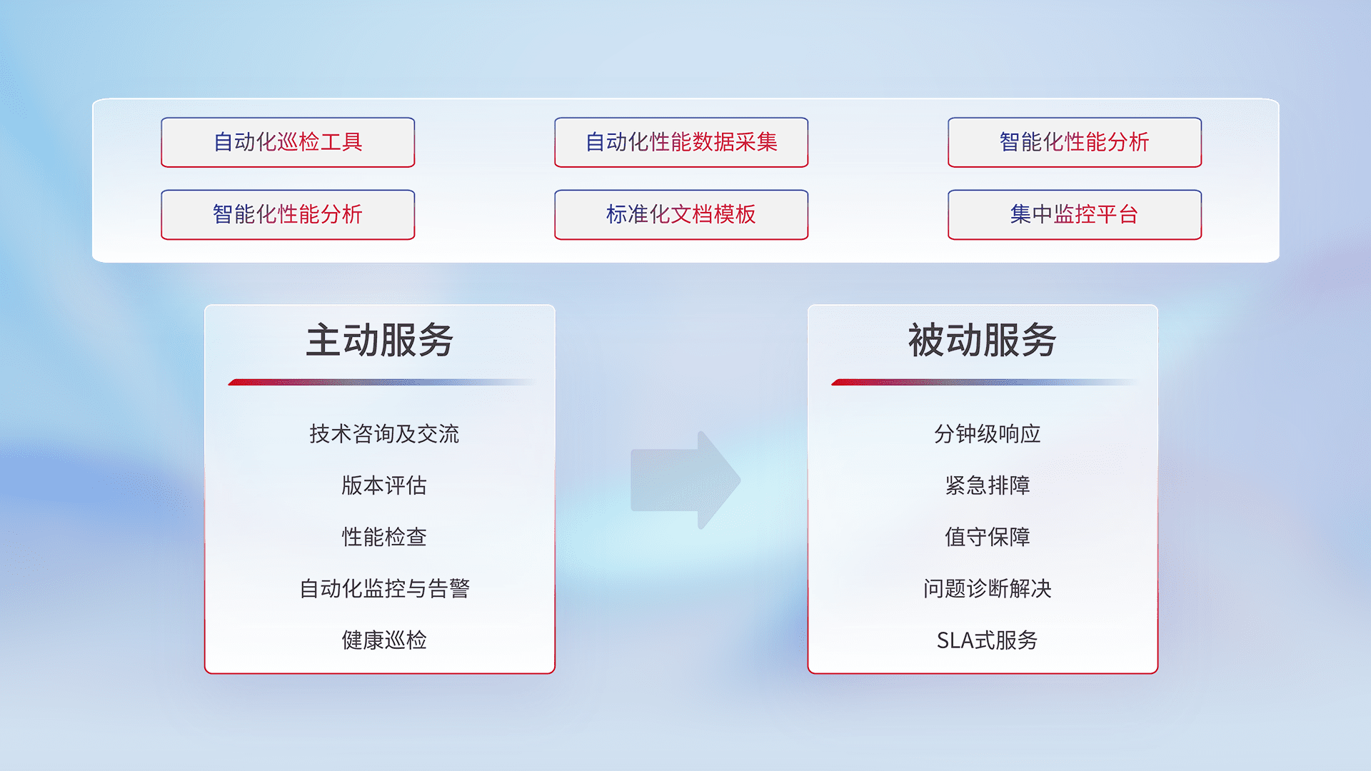 智能化工具和标准化文档,,,保障服务质量,,,,提供主动服务(包含技术咨询、、版本评估、、、性能检查、、、、自动化监控与告警、、、健康巡检)和被动服务包含(分钟级响应、、紧急排障、、、、值守保障、、问题诊断解决、、、、SLA服务)。。。